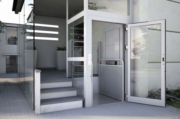 El salvaescaleras vertical A28 permite salvar desniveles hasta 2 metros fácilmente y con total seguridad. Hueco protegido con puerta en piso inferior y verja en el superior.