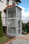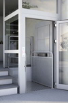 • La plataforma se suministra con puerta de 2 metros de altura en el piso bajo y verja de 1,1m de altura en el piso superior. De apertura manual hacia el exterior en aluminio color RAL 9023 gris perlado o RAL 7040 gris liso y vidrio transparente de seguridad. Paso libre de 70 a 95 cm. según tamaño de plataforma. Con manilla empotrada, cerradura electromecánica de seguridad y mando de piso colocado en el marco.
