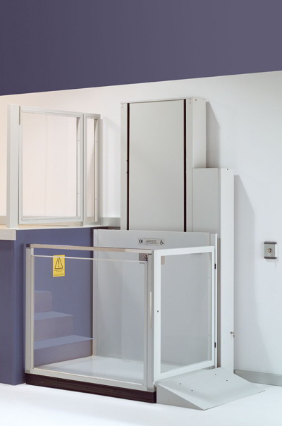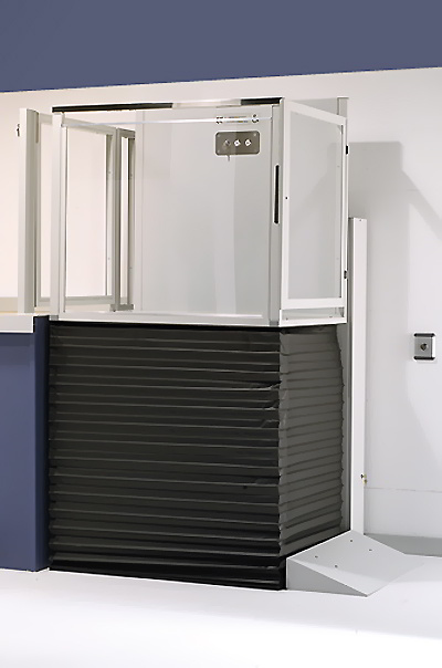El salvaescaleras vertical Izaro permite salvar desniveles hasta 2 metros fácilmente y con total seguridad. Hueco protegido con fuelle en piso inferior y puerta a bordo y en parada superior.