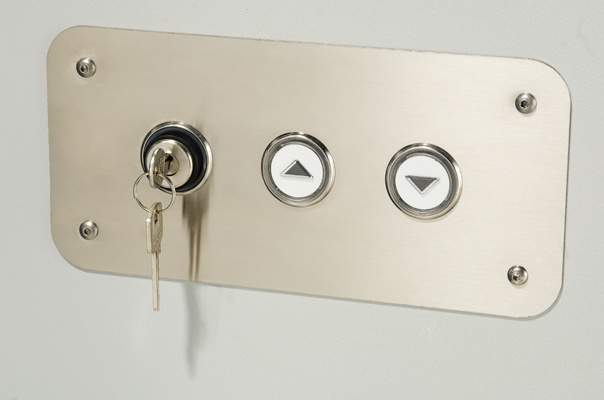• De pulsación permanente. Botonera a bordo, con luz de subida y bajada. En el piso superior, pulsador colocado sobre la puerta y, en el piso inferior, pulsador colocado sobre la columna. Mandos habilitados con llave para evitar su uso inadecuado.