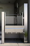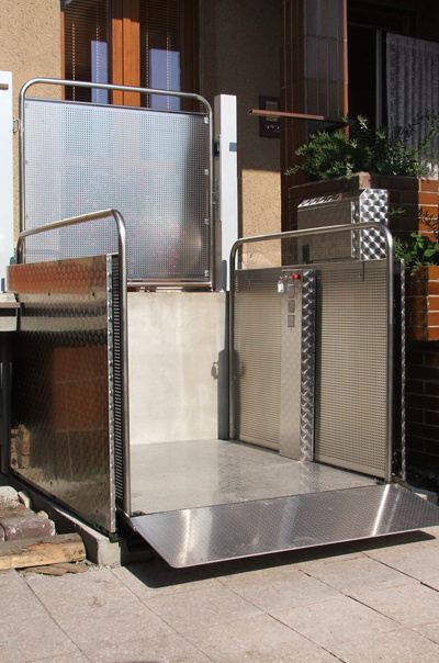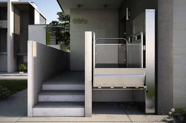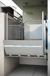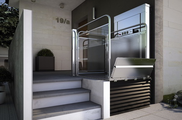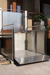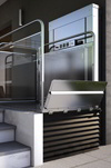El salvaescaleras vertical Silver permite salvar desniveles hasta 1 metro fácilmente y con total seguridad. Sistema compacto con fuelle, bandeja de acceso plegable en piso bajo y verja en piso superior.